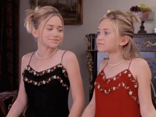 Mary-Kate and Ashley Olsen stand together, wearing elegant matching dresses.