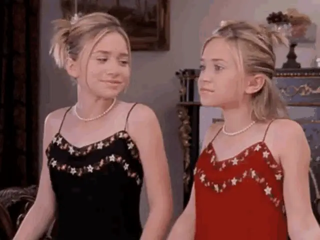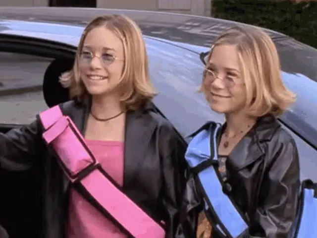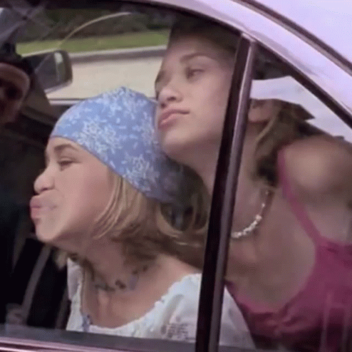 Ashley and Mary-Kate Olsen making funny faces and blowing kisses from a car window.