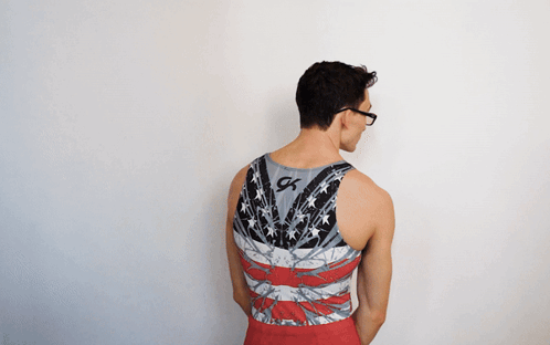 Gymnast Stephen Nedoroscik, wearing a USA leotard, turns and points directly at the viewer.