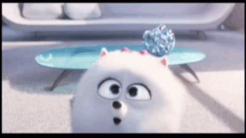 Gidget, the fluffy white dog, looks surprised and concerned, then quickly moves and reappears.