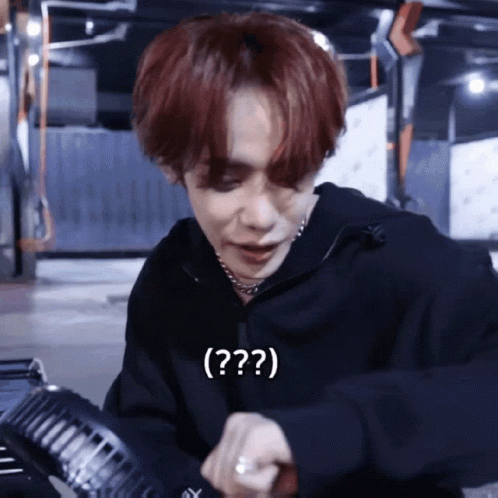 Omega X member Xen (Lee Jinwoo) looks confused, wearing a black hoodie and silver chain, with a '???' caption.