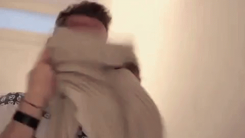 Jack Howard and Dean Dobbs show emotional reactions while covering their faces with sweaters.