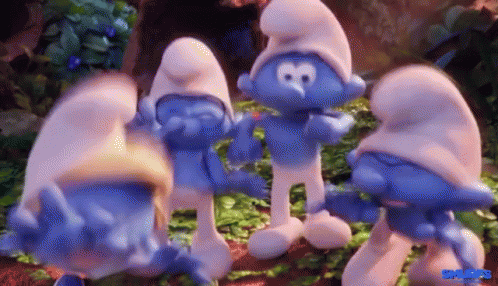 Smurfs characters from The Lost Village appear shocked and surprised in a vibrant forest setting.
