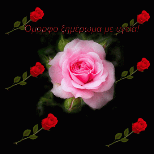 A beautiful pink rose surrounded by vibrant red roses, set against a dark background.