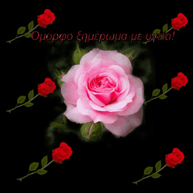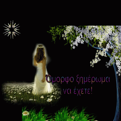 Girl in white dress with sparkling effects and Greek text 'ομορφοξημερωμα' (beautiful morning).