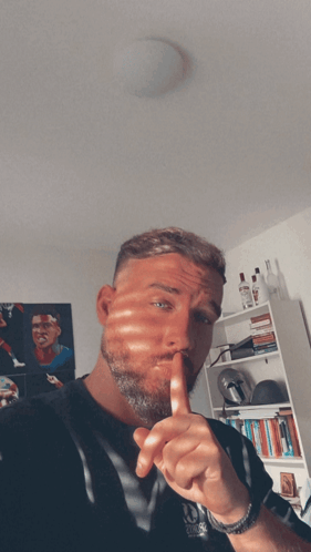 A man with a beard makes a 'shhh' gesture, part of the Oms Mew Meme trend.