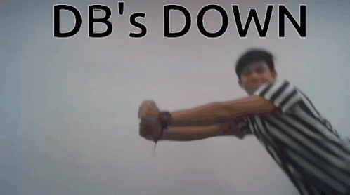 Man in striped shirt doing a happy dance, with "DB's DOWN" text displayed prominently.