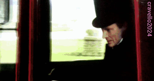 Man in top hat rides a horse-drawn carriage, looking out the window, on his way.