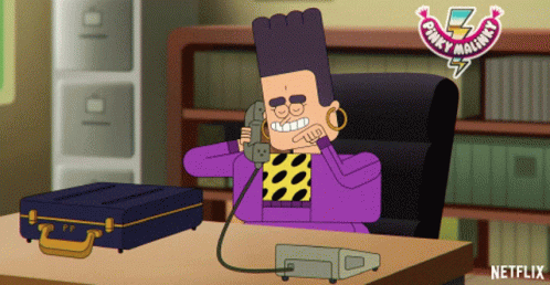 A character from Pinky Malinky talks on an old-fashioned phone, grooving to a catchy tune at their desk.