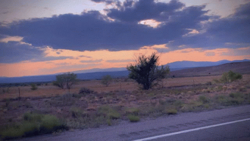 Catie Offerman's scenic road trip through a desert landscape at sunset, with mountains in the distance.