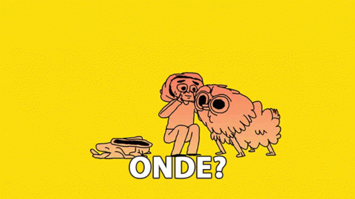Cartoon characters look for something with the Portuguese word "ONDE?" (WHERE?) displayed.