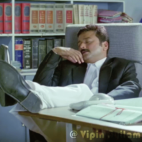 Jayaram from One Man Show relaxing in his office, feet up on the desk.