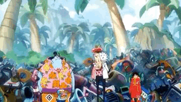 a group of cartoon characters standing in a pile of trash .