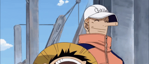 Kaku and Monkey D. Luffy from One Piece, set during the Water Seven arc, with Kaku wearing his Galley-La hat.
