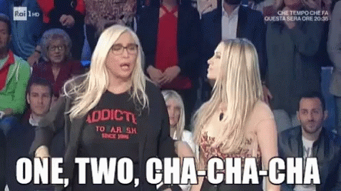 Mara Venier and another woman energetically dance to 'One Two Cha Cha Cha' on an Italian TV show stage.