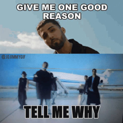 Aaron Carter meme featuring 'Give Me One Good Reason' and 'Tell Me Why' captions, with two men.