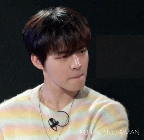 ONF's Hyojin captured in a close-up, biting his lip while wearing a pastel striped sweater.