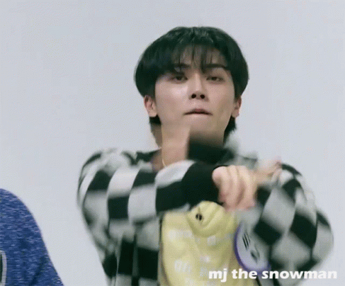 ONF's Minkyun shows a refreshing, high-energy reaction, with 'mj the snowman' text visible.
