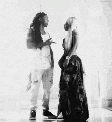Nicki Minaj and Lil Wayne in a black and white scene, engaged in a conversation.