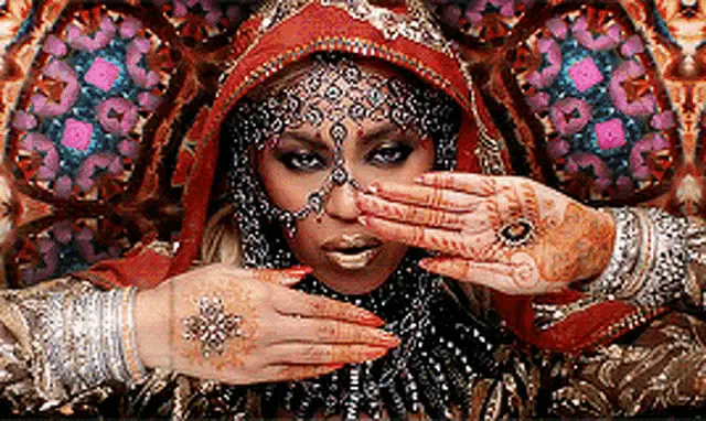 Beyoncé, featured in Onikaski Dreamdollars, wearing red lipstick and a white shirt, looking intently.