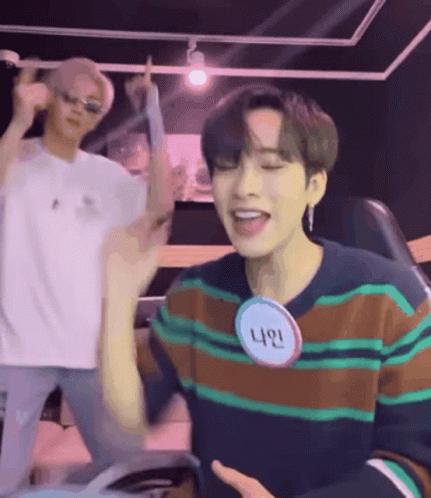 Onlyoneof's Nine and another member dancing energetically in a room with pink lighting.