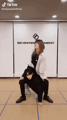 OnlyOneOf members Rie and Junji share a playful moment, with Rie getting a piggyback ride from Junji before they pose and dance.