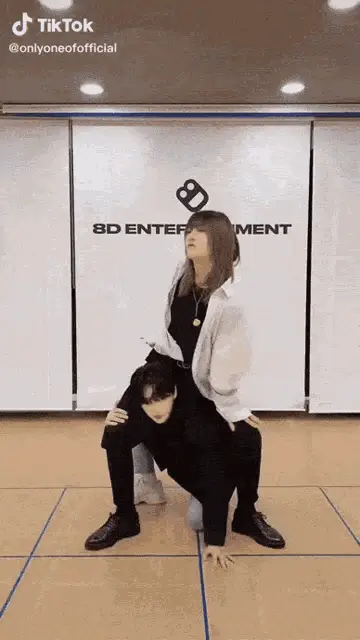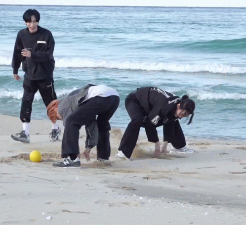 Onlyoneof members Rie and Kb enjoy a playful moment on the sandy beach, bending down near a yellow ball.