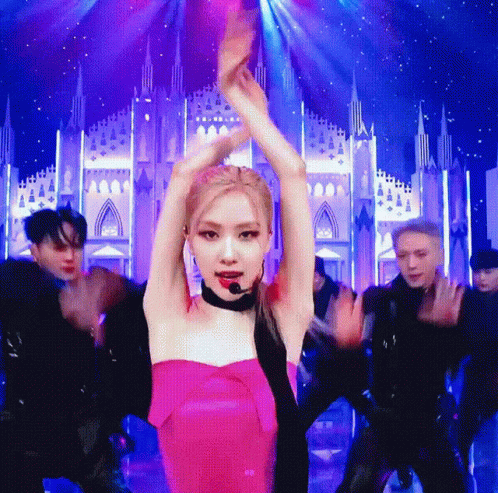 Blackpink Rosé performs her hit song 'On The Ground' (OTG) on stage, wearing a vibrant pink dress.