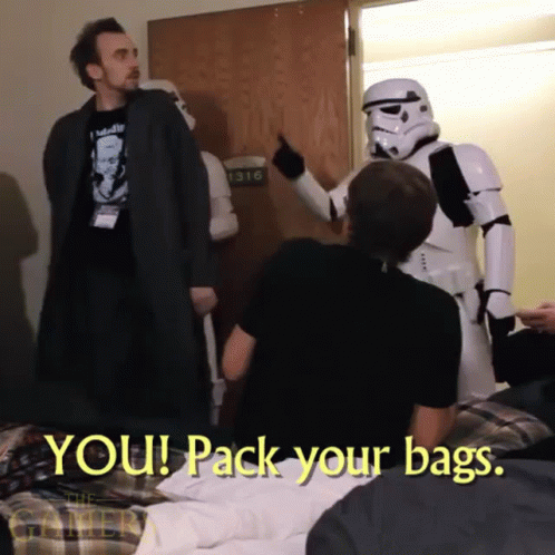 Stormtroopers from Onwaaard Zombie Orpheus order people to 'Pack Your Bags' and 'OUT!' from a room.