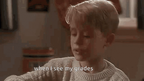 A young boy reacts with an 'oof' expression, reflecting the common meme 'when I see my grades'.