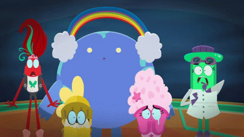 Triviatopia characters Tina, Pop, Alison, Tito, Bonzo, and Hector react with an 'Ooopsie' moment.