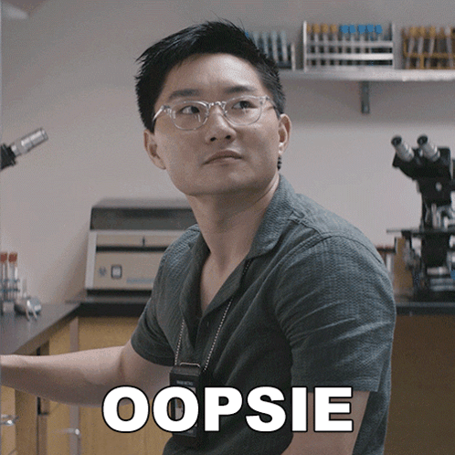 Vince Masuka, wearing glasses and a shirt with 'OOPSIE', reacts in a lab setting.