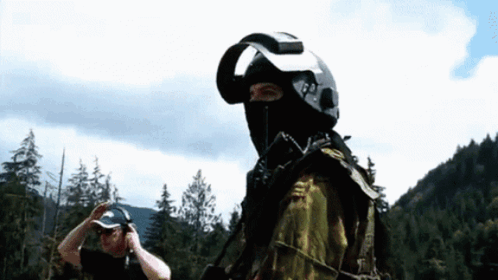 A person in a tactical helmet and camouflage gear stands outdoors, possibly being photographed.
