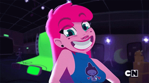 Any Malu, a cartoon girl with pink hair, looks surprised and caught off guard in a vibrant setting.