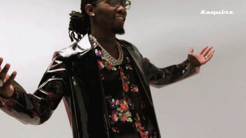 Offset dancing with arms outstretched, wearing a black jacket and floral shirt for an Esquire feature.