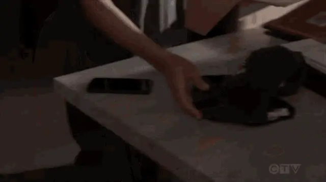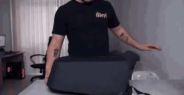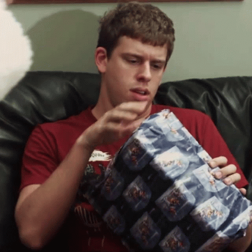 Corey Vidal sits on a couch, focused on unwrapping a patterned gift, revealing its contents.