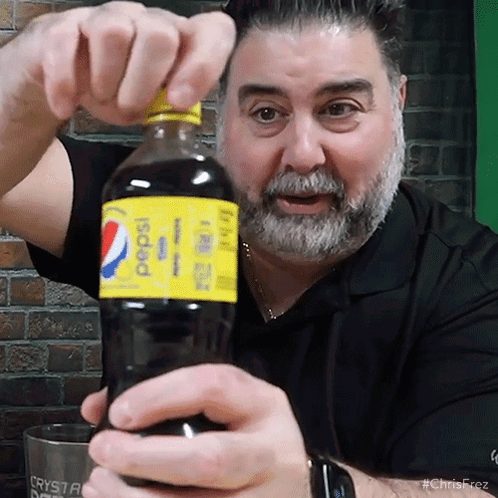Chris Frezza smiles as he opens a bottle of Pepsi with a yellow label, preparing to taste the soda.