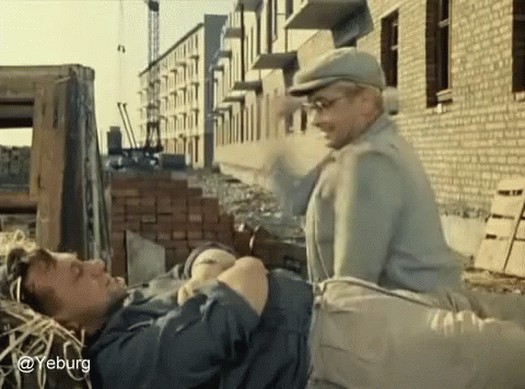 A man lying on hay gets a comedic slap from another man with a board, from the film Operation Y.