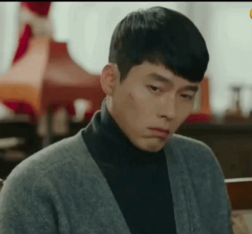 Korean actor Hyun Bin, looking handsome in a turtleneck and cardigan, makes a charming funny face.
