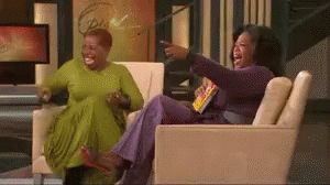 Oprah Winfrey and another woman share a moment of uproarious laughter on a talk show set.