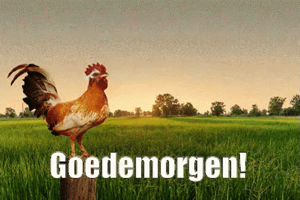 A rooster crows on a post in a green field as the sun rises, wishing a good morning.