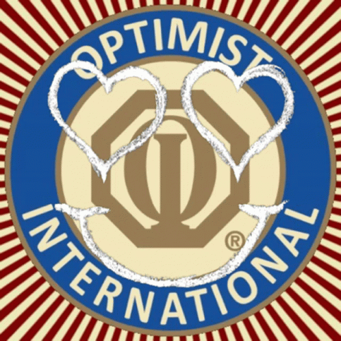 Optimist International logo featuring two hearts and a smiley face, set against a red and white striped background.