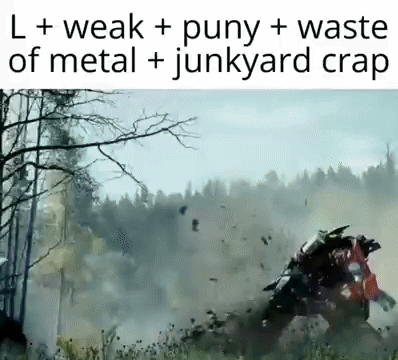 Optimus Prime defeats Megatron in a forest battle, mocked with 'L + weak + puny + waste of metal + junkyard crap' meme.