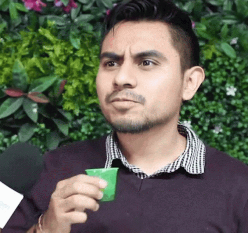 Manu says 'Órale' with a smile while holding a green cup during an interview.