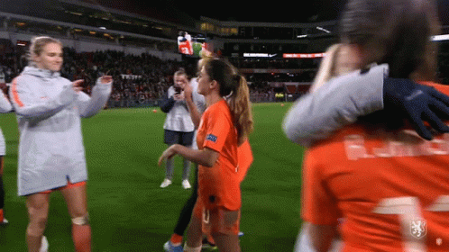 Danielle Van De Donk and Oranje Leeuwinnen teammates, including Vivianne Miedema, share emotional hugs on the field.