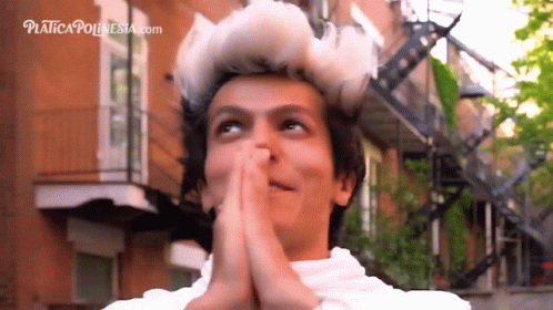 Rafa Polinesio praying with hands clasped, looking up hopefully, website visible.