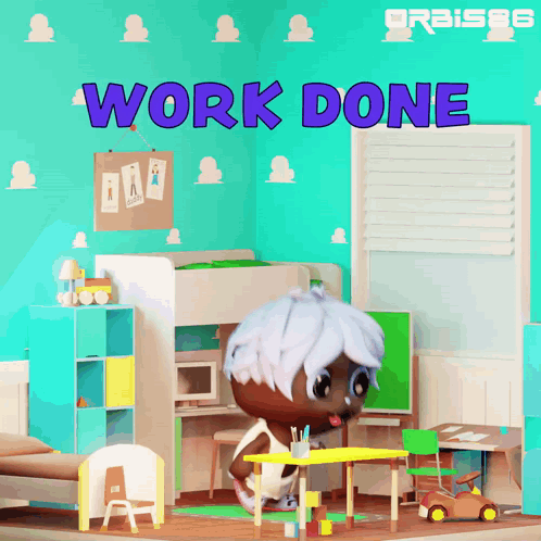A 3D animated Orbis86 character celebrating 'Work Done' in a colorful room.