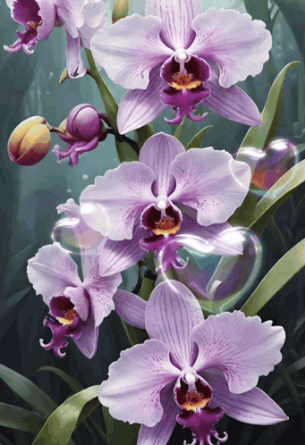 A beautiful digital painting of vibrant purple orchids with shimmering heart-shaped bubbles floating around them.