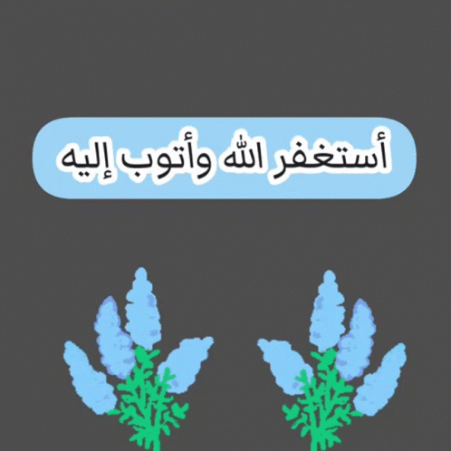 Animated blue flowers frame an Arabic phrase 'I seek forgiveness from Allah and repent to Him' on a dark background.