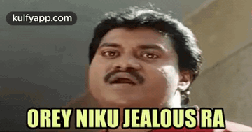 Man with an intense gaze and mustache, asking 'Orey Niku Jealous Ra' with a serious expression.